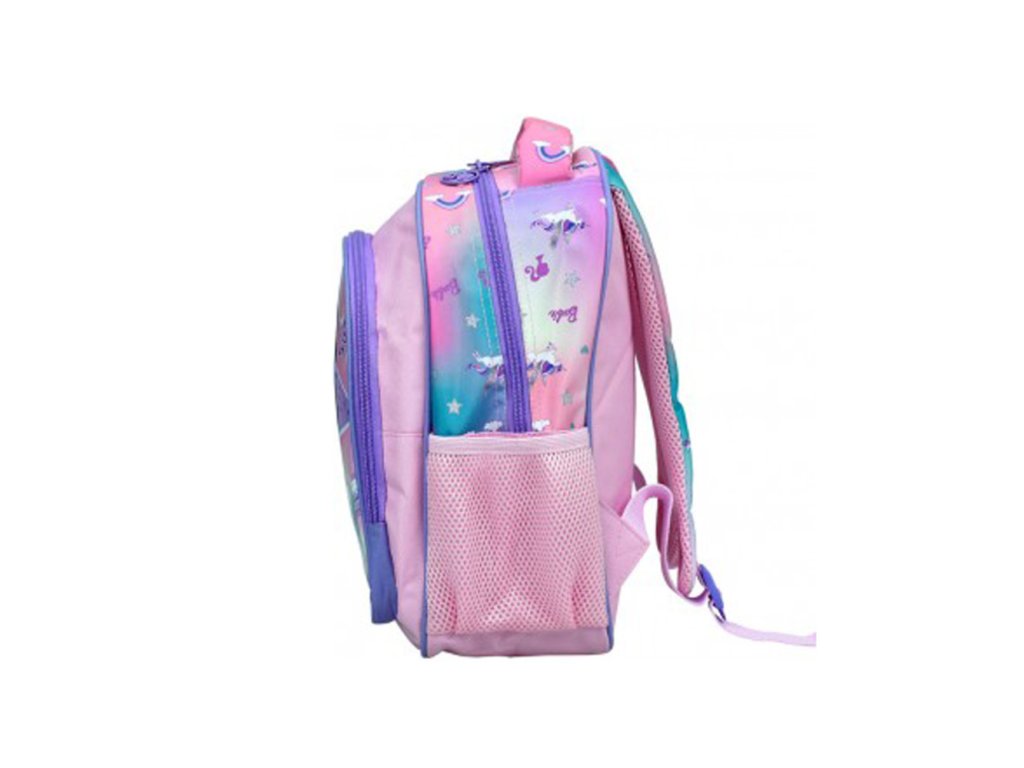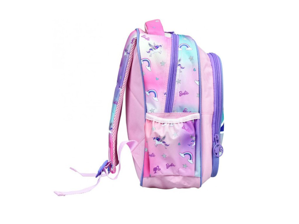 Batoh má dvě prostorné komory na zip, které umožňují přehledné uložení potřeb, svačiny i drobností. Na bocích jsou praktické kapsy vhodné například na láhev s pitím. Přední kapsa s výrazným motivem Barbie a jednorožce dodává batohu jedinečný vzhled.