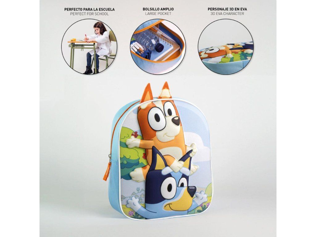 3D dětský batoh BLUEY A BINGO jedna kapsa modrý 31 cm
