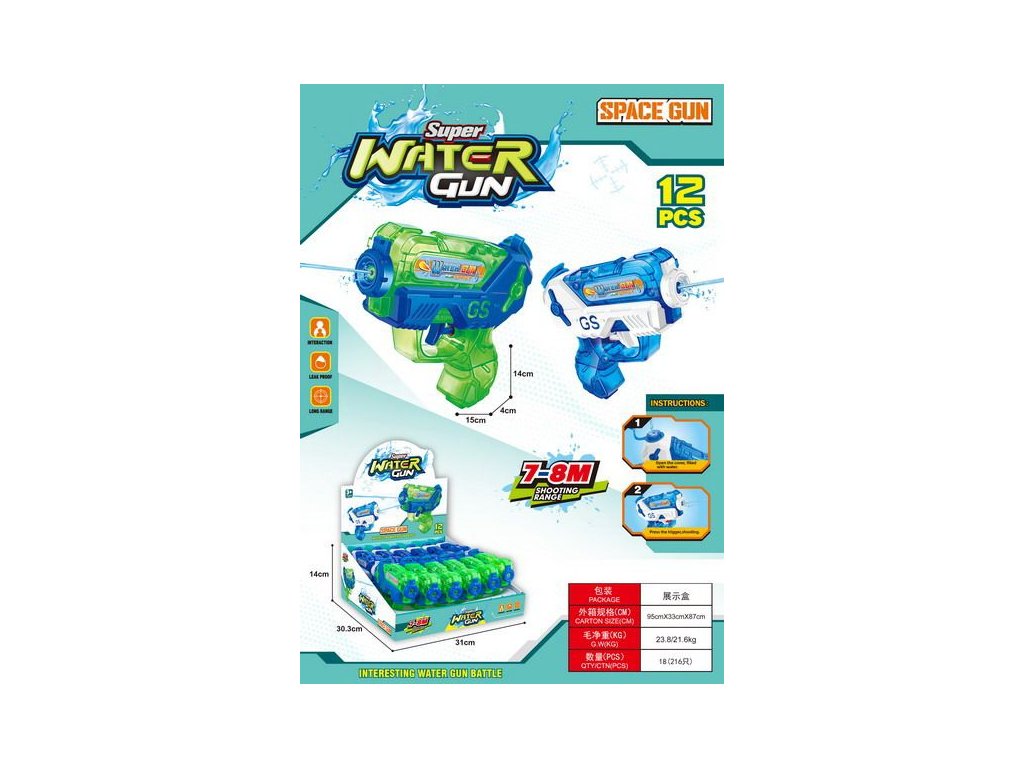 Vodní pistole průhledná. Přesné rozměry 15x4x14 cm.