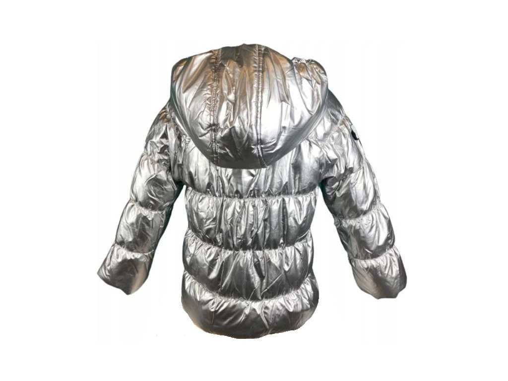 Luxusní zimní bunda s metalickým stříbrným efektem je určena pro holky, co se rády parádí. Zimní bunda s kapucí je vyrobena z příjemného, teplého a zároveň odolného a pro dítě bezpečného materiálu. Bunda je vyteplená, prošívaná, tělo je podšito velmi hřejivým polar fleecem. Konce rukávů jsou opatřeny volnější pružnou gumičkou a stejně tak i spodní lem bundy, což skvěle chrání před větrem. Bunda má zapínání na zip, součástí jsou dvě kapsy a vkusná nášivka na rukávu.