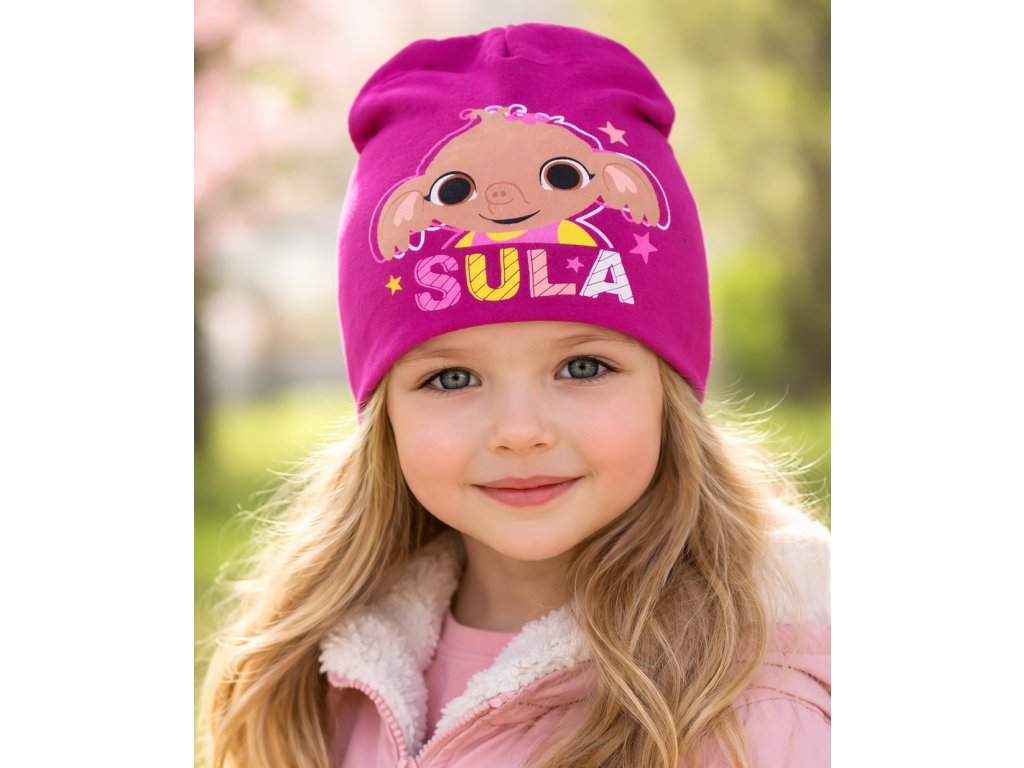 Roztomilá dívčí čepička se slonicí Sulou z oblíbené pohádky Králíček Bing je ideální volbou na jaro, léto i podzim. Sytě růžová barva, hravý motiv a pohodlný střih potěší každou malou parádnici.