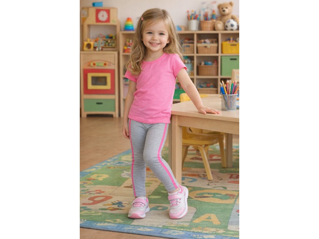 Šedé dívčí legíny se slušivým růžovým lampasem na nohavicích. Legíny budou krásně sedět, jsou výborně pružné a lehce se přizpůsobí postavě. Nízká cena a kvalita je ta nejlepší kombinace, kterou tyto legíny splňují do puntíku.