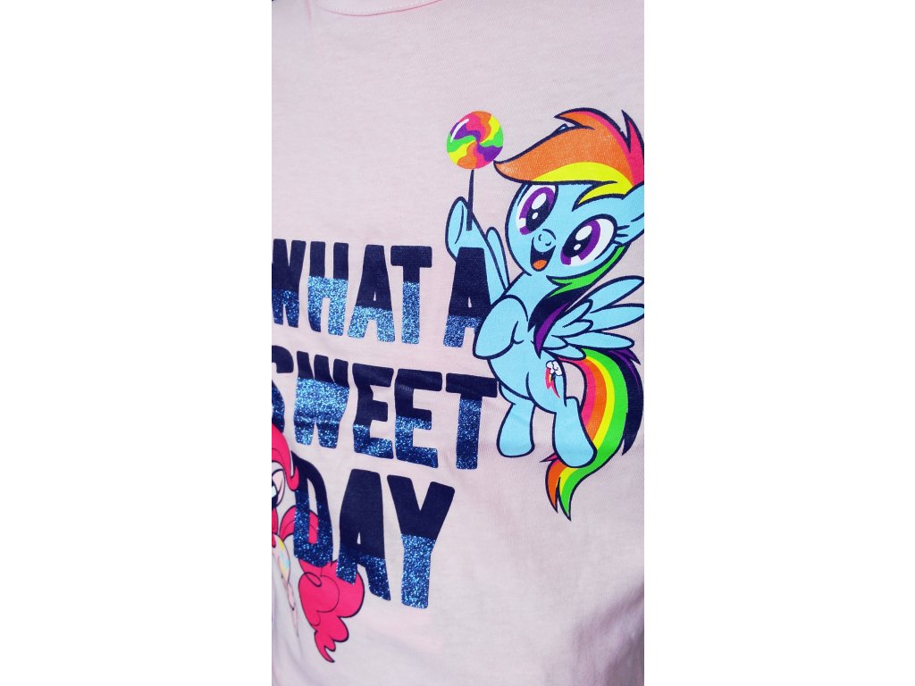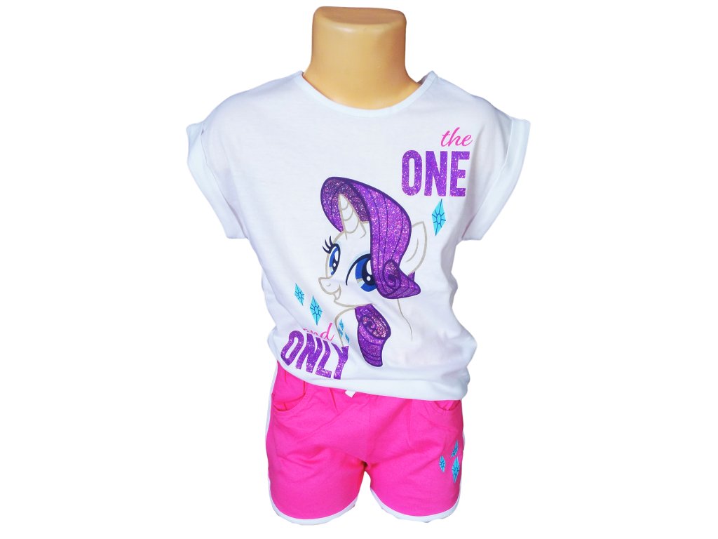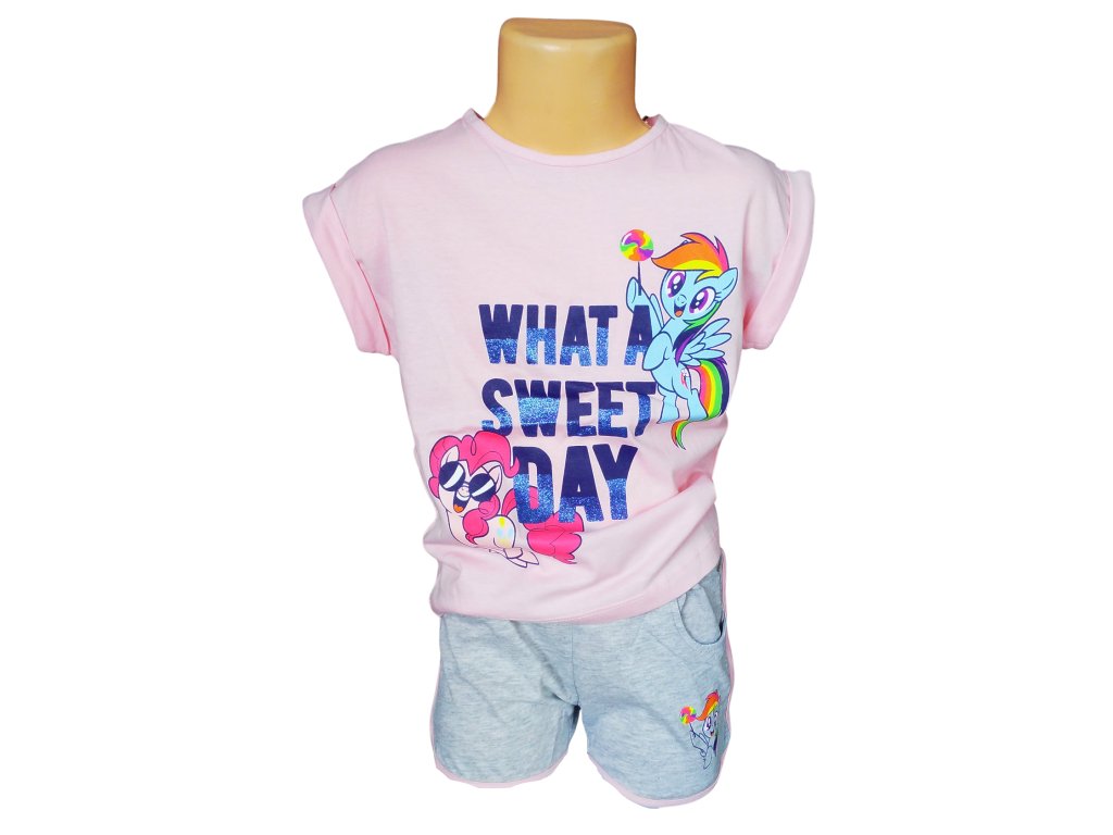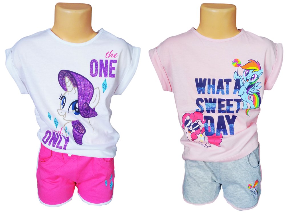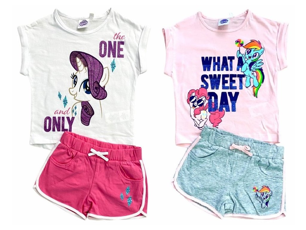 Letní set My little pony pro holky, co fandí kouzelným poníkům. Letní komplet je velmi příjemný, vyrobený z krásně pružné bavlny, tričko má lehce prodloužený zadní díl, motiv je vkusně přizdoben třpytkami a šortky mají nezbytné kapsičky.