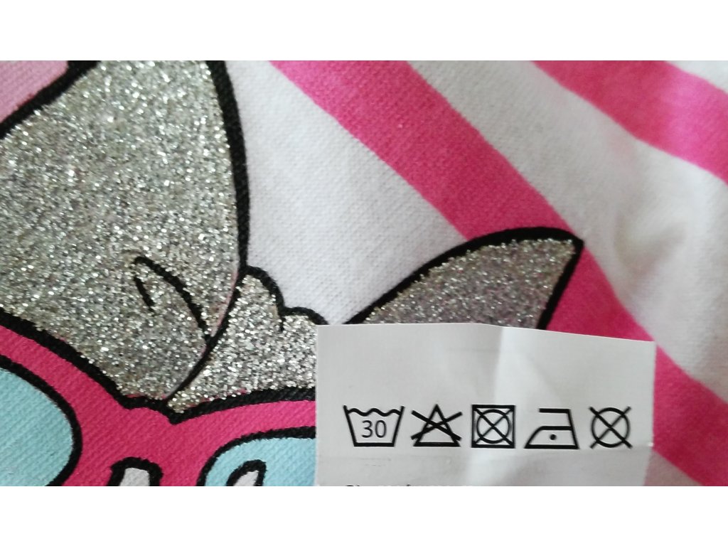 Nádherný a velmi příjemný letní setík s úžasným velkoplošným motivem na tričku, který je plný zářivých barviček a lehce přizdoben třpytkami. Tričko má v dolní části bohatě řasený volánek, u šortek je v pase velmi pružná guma, která je doplněna funkční šňůrkou.
