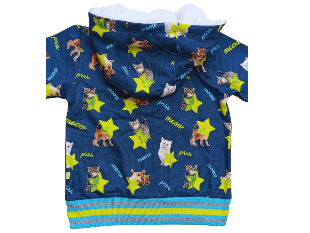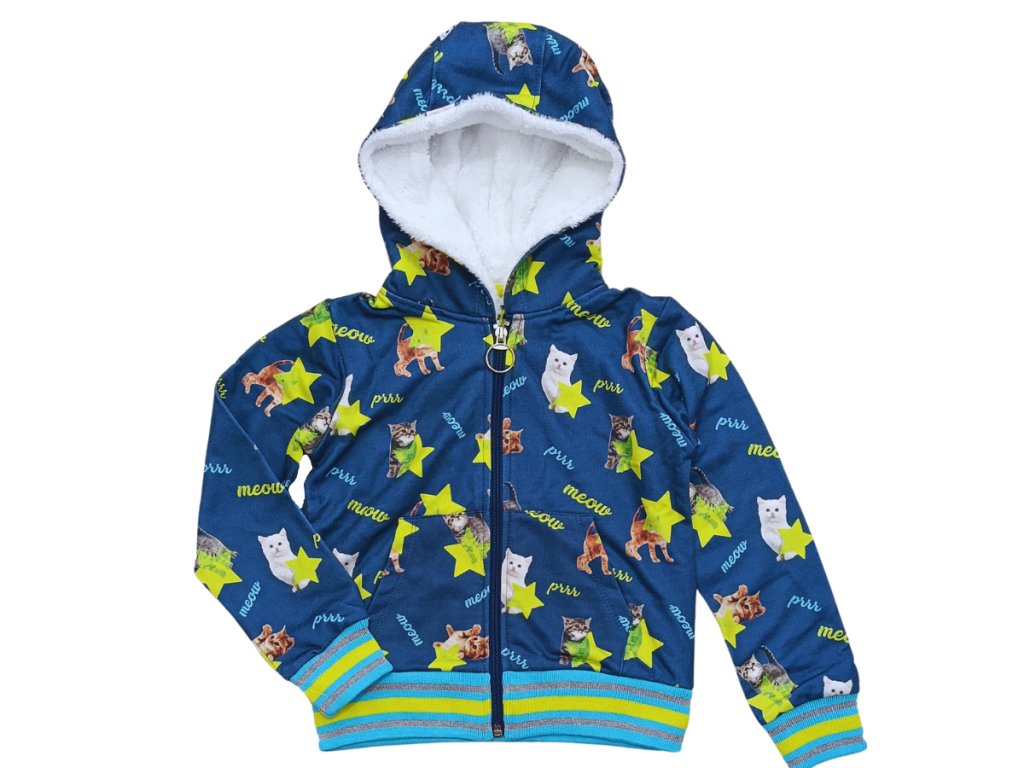 Krásná dívčí mikina s motivem kočiček. S klokaními kapsami, s kapucí, která je vyteplená jemnou a příjemnou chlupatinkou. Ukončení do pratických manžet, zapínání na zip.