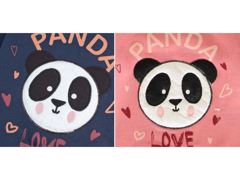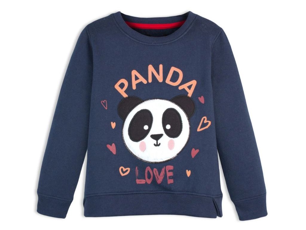 Dívčí mikina přes hlavu s luxusním našívaným motivem ve tvaru hlavičky roztomilé pandy. Mikina se pyšní vysokým podílem bio bavlny a krásným zpracováním. Je vhodná pro chladnější období, z rubové strany má příjemný hřejivý chloupek. Motiv okaté pandy je lehounce přizdoben třpytkami.