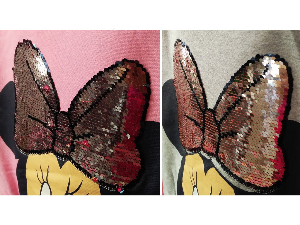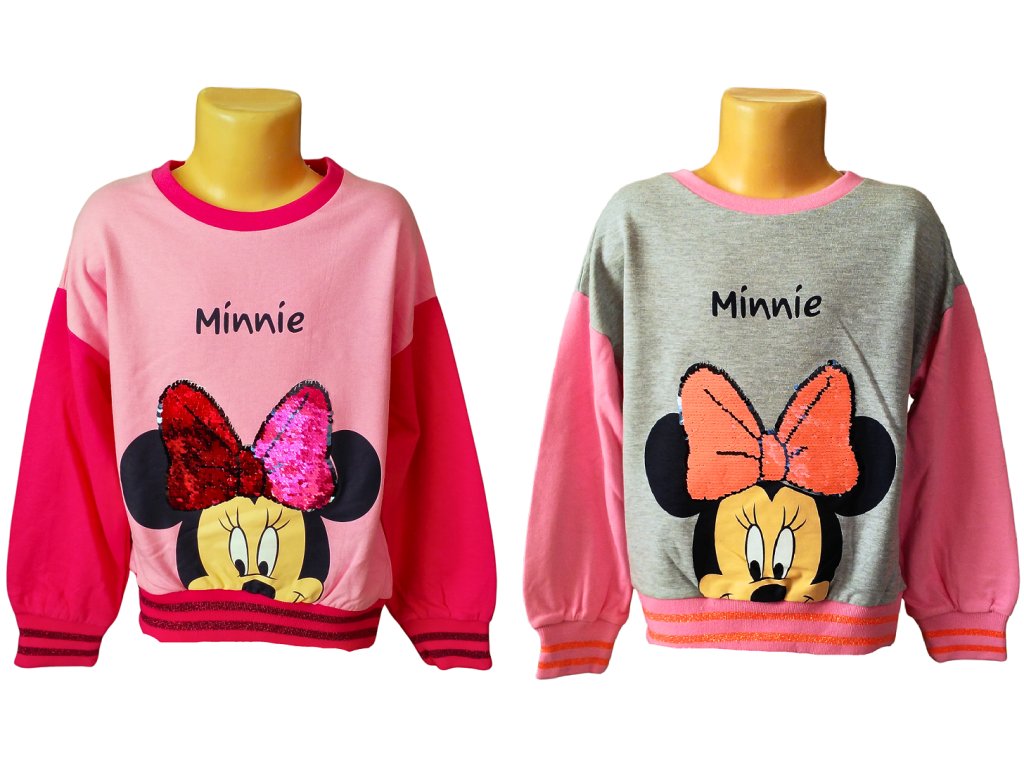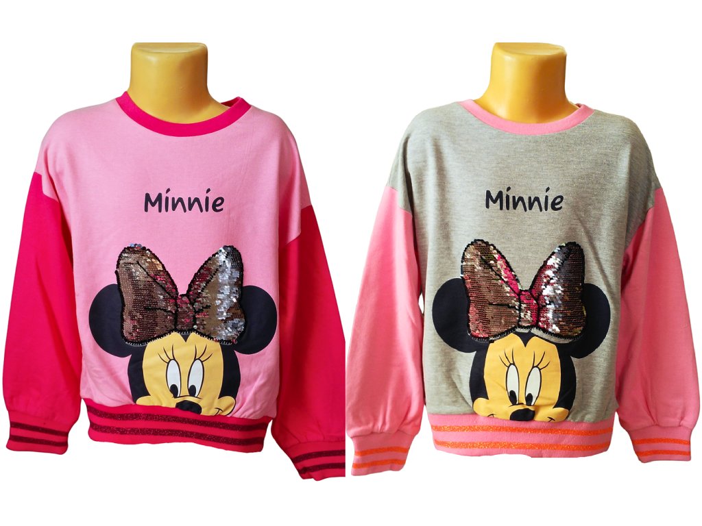 Krásná i praktická mikina s myškou Minnie a kouzelnou mašlí s měnícími se flitry. Barvu třpytivé mašle si holky určí samy, podle momentální nálady. Mikina je vhodná jako celoroční, je bez kapucky a tedy vhodná i pro vrstvení oblečení pod bundu. krásné a hlavně super pružné jsou i manžety, které zdobí třpytivá lurexová nitka. Na zadní straně je nápis Minnie se srdíčkem.