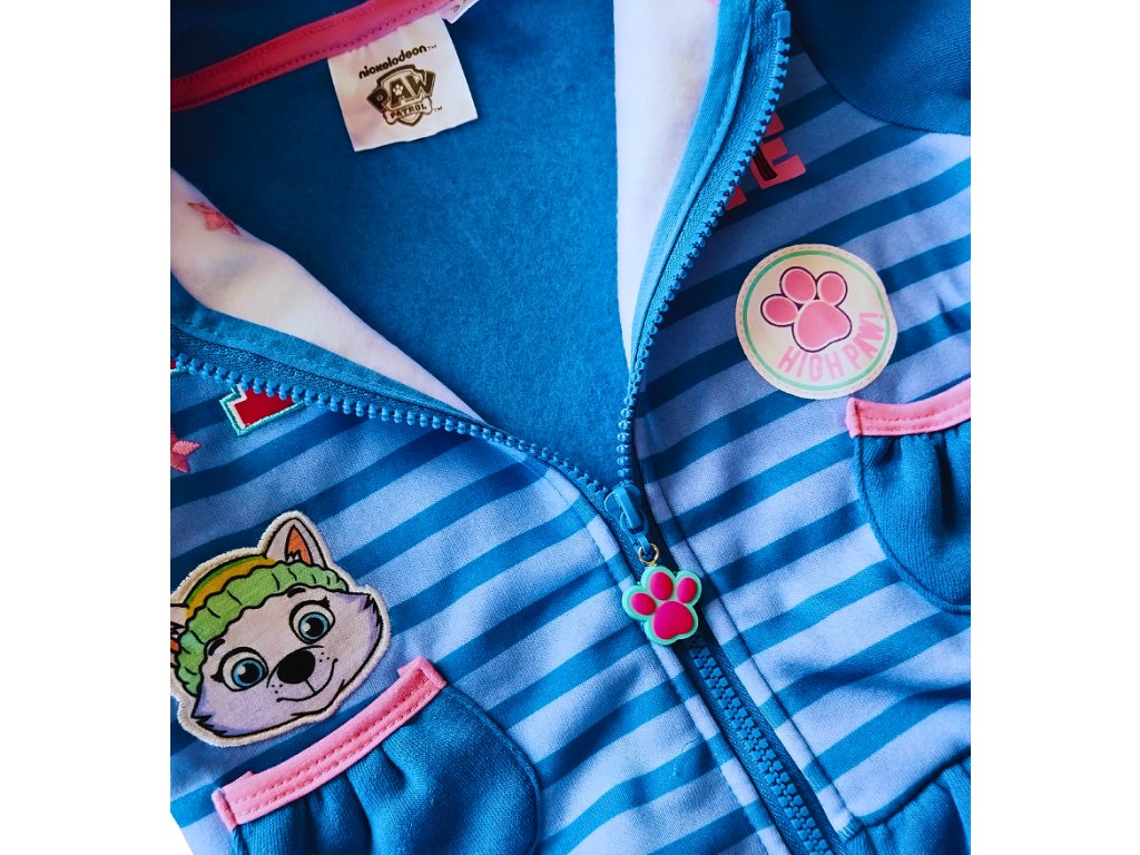 Tato dívčí mikina s Tlapkovou patrolou patří mezi nejkrásnější kousky. Mikina je skutečně velmi nádherná a slušivá. Má roztomile řešené kapsičky, krásný bohatě řasený volánek a je plná motivů Paw patrol. Na jezdci zipu je také gumová ozdoba v podobě tlapičky. Z rubové strany je jemný hřejivý chloupek a rukávky jsou ukončeny praktickými pružnými manžetami.