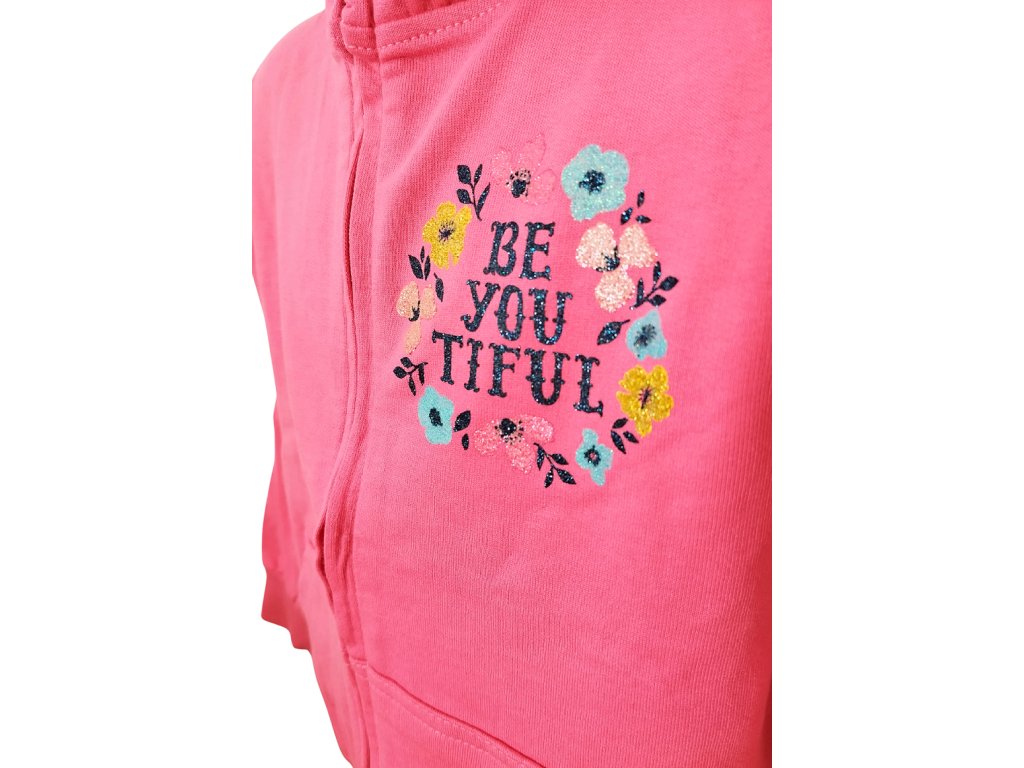 Příjemná a líbivá bavlněná mikina Venere. Mikina má sytou růžovou barvu, zapínání na zip, kapucu a břišní kapsy. Je bez hřejivého chloupku a tedy vhodná jako celoroční. Ukončení je do pružných manžet a motiv je krásně přizdoben třpytkami.
