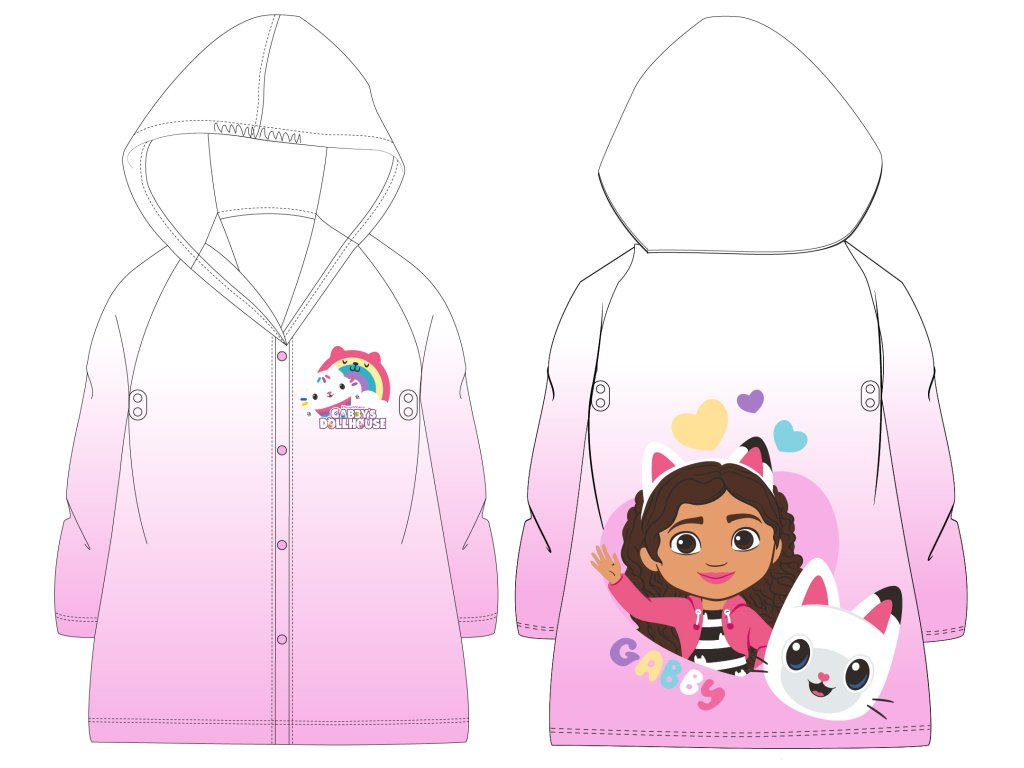 Dívčí pláštěnka Gábinin kouzelný domek je velmi kvalitní dětská pláštěnka v krásné růžovobílé transparentní barvičce, kdy růžová přechází v průsvitnou bílou. Na zadní straně je nádherný velkoplošný motiv. Pláštěnka je poddajná, měkoučká a přitom pevná, v podpaží je odvětrávání, aby se děti nepotily. Zapínání má na druky, takže to zvládnou i malé ručičky našich dětiček.