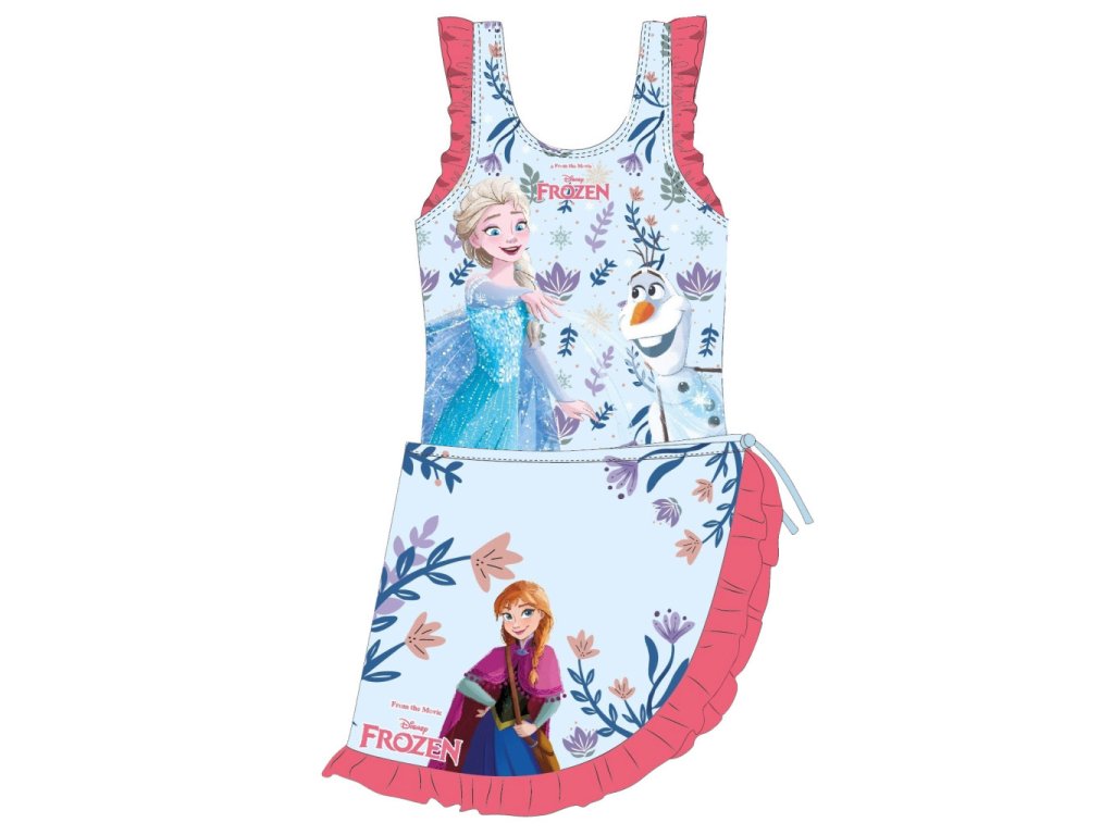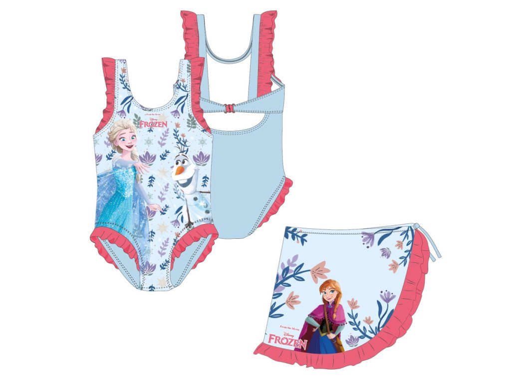 Jednodílné plavky zdobí Elsa s Olafem v jemném modrém provedení doplněném o drobné květinové motivy. Součástí setu je také lehký sarong s Annou, který lze jednoduše uvázat kolem pasu a vytvořit tak originální outfit na pláž i k bazénu.