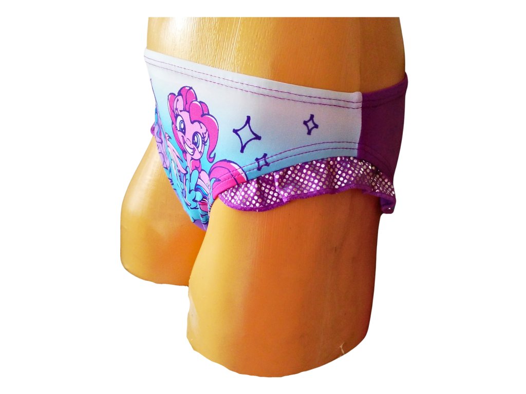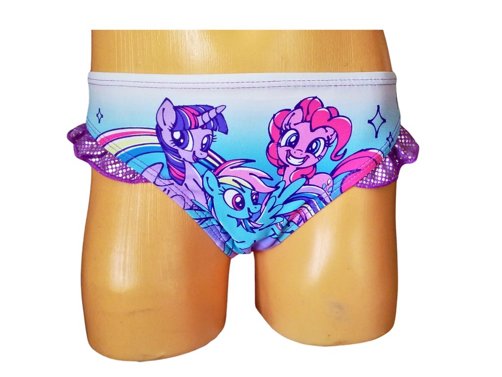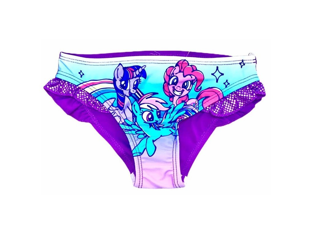 Pohodlné kalhotkové plavky s celolátkovým motivem kouzelných poníků. Plavky My little pony pro holky mají na předním díle obrázky oblíbených poníků Twilight Sparkle, Pinkie Pie a Rainbow Dash, zadní díl je fialový. Plavky jsou přizdobeny volánky se třpytivým efektem. Jsou velmi pohodlné a příjemné.
