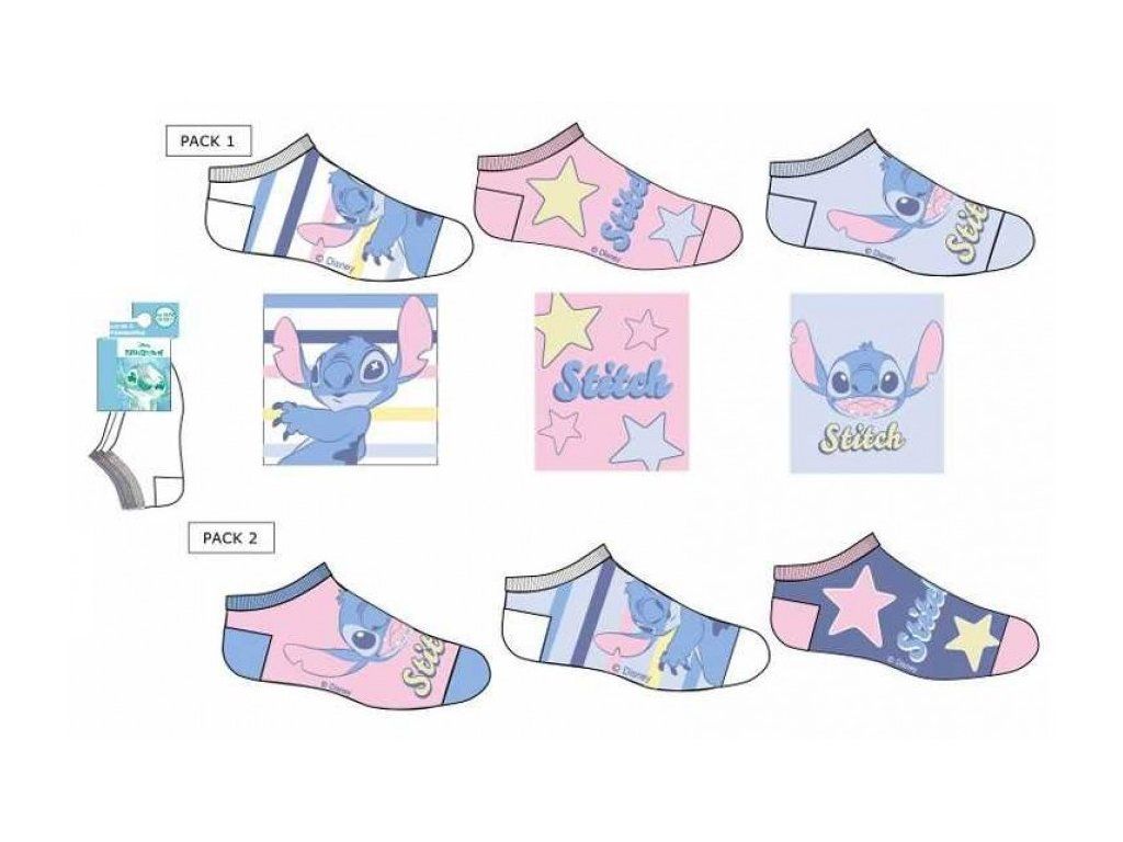 Dívčí kotníkové ponožky LILO A STITCH v balení 3 párů přinášejí pohodlí a hravý design pro každodenní nošení. Oblíbený Stitch se objevuje na každém páru v různých barevných kombinacích – od jemné růžové přes modrou až po kombinace s hvězdičkami a proužky.