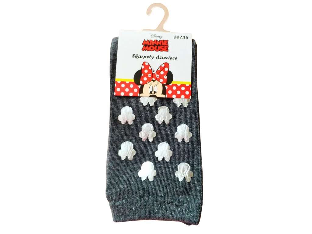 Dívčí ponožky s motivy myšky Minnie, které jsou zdobeny metalickými srdíčky. Ponožky jsou pružné a výborně se přizpůsobí, nespadávají ani neškrtí.