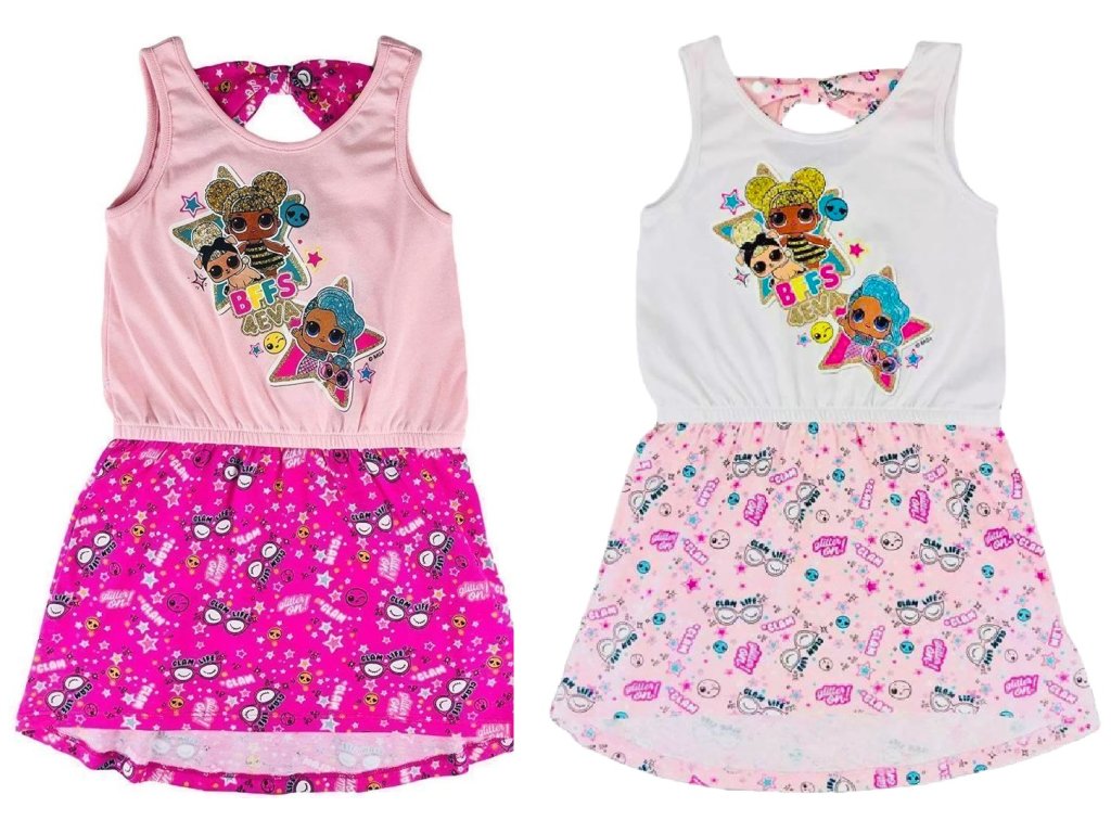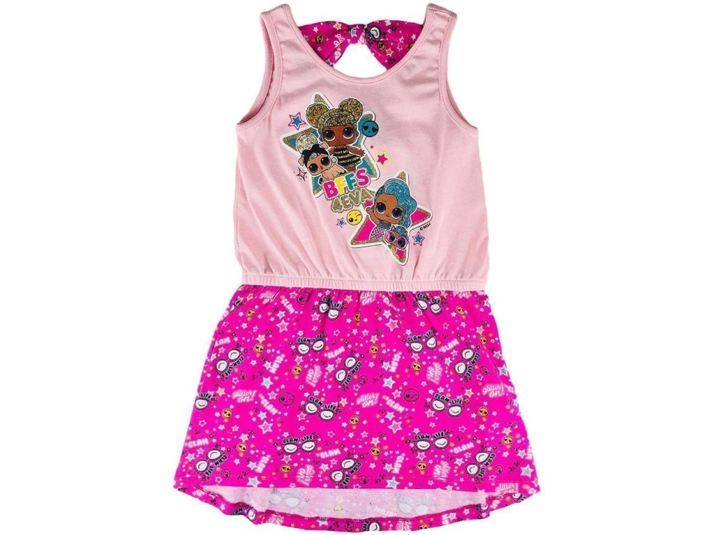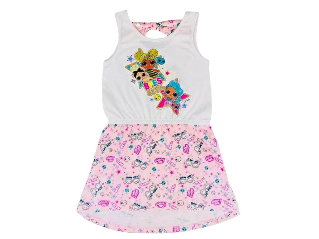 Extra příjemné letní šaty s panenkami LOL Surprise. Šaty mají prodloužený zadní díl, velmi pružnou gumku v pase a jsou vyrobeny z extra příjemné a heboučké bavlny. Navíc mají velmi líbivý motiv, který je přizdoben třpytkami. Šaty holky využijí na doma, do města i na zahradu.