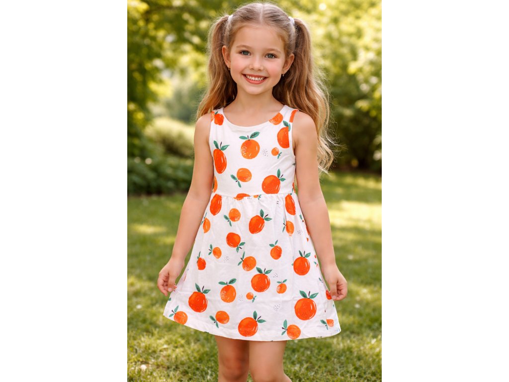 Krásné a veselé letní šaty, které dívky využijí v teplých letních dnech a to do města, do školy, na doma i zahradu. V pase je velmi pružná guma, která neškrtí a umožní dostatečně volný pohyb při běžných denních aktivitách našich dětiček. Motivy pomerančů jsou látkové a šatičky mají velmi pohodlný střih.