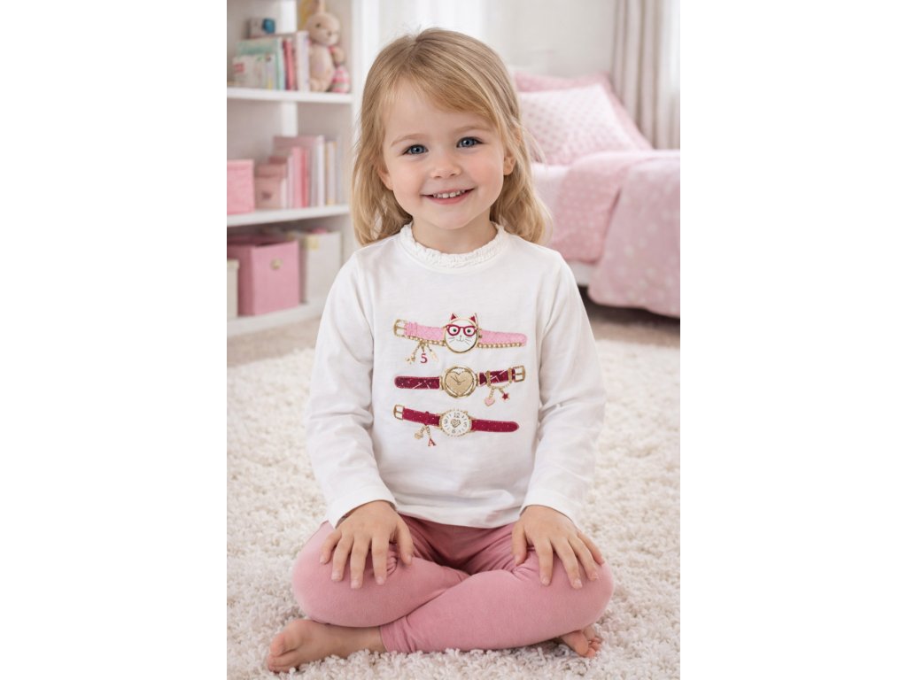 Extra pružné tričko pro holky. Bavlněné tričko je díky přídavku elastanu úžasně pohodlné a velmi dobře se přizpůsobí se postavě. Motiv s hodinkami je lehce přizdoben i třpytkami, které holky milují. Tričko s dlouhým rukávem pro chladnější dny je vyrobeno z kvalitní bavlny, u krku je lehce do zdobeného stojáčku a za krkem má dva funkční knoflíčky.