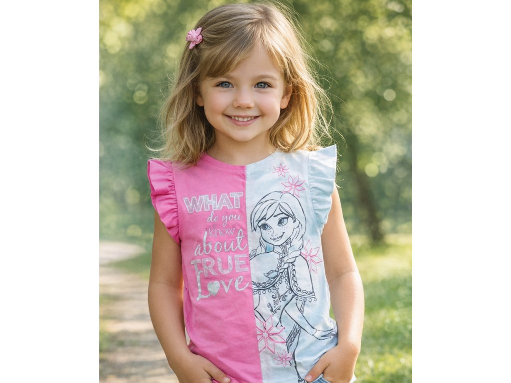 Krásné dívčí tričko s oblíbeným motivem pohádky Frozen (Ledové království). Tričko je zajímavé tím, že má atypický střih, na předním díle je vyobrazena Anna. Tričko je velmi pohodlné a příjemné, přizdobeno třpytkami. Měřen kratší díl.