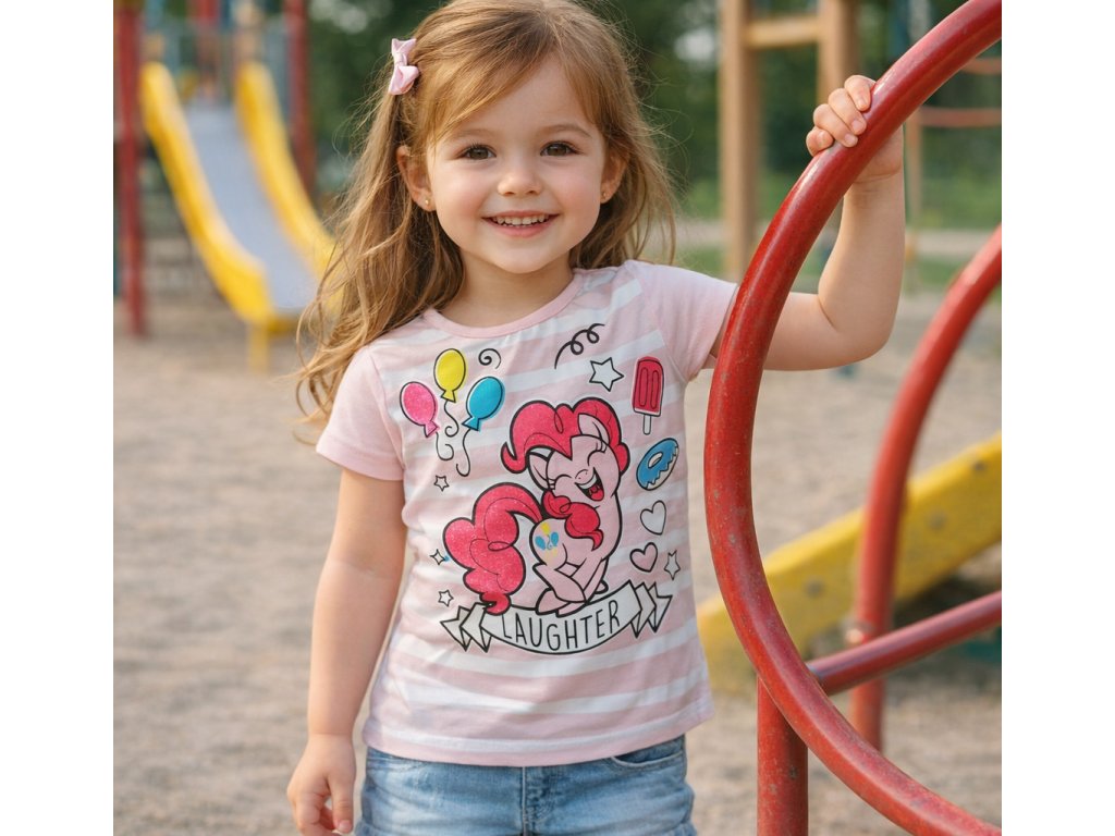 Krásné bavlněné tričko My little pony plné letní skvělé nálady. Veselé tričko s krásným motivem růžového poníka Pinkie Pie. Tričko je klasického střihu s kulatým výstřihem a nezbytný lesk a třpyt mu dodává růžová hříva poníka Pinkie Pie, která je poseta třpytkami.