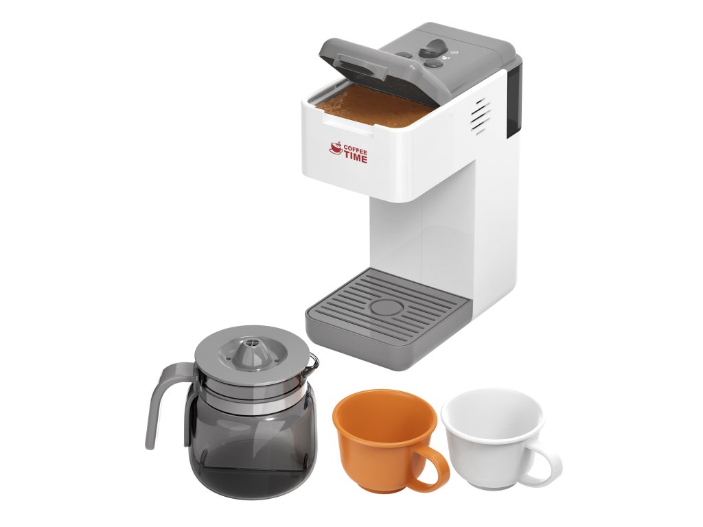 Kávovar s konvicí a tekoucí vodou. Světelné a zvukové efekty.