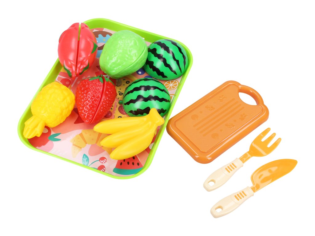 Potraviny ke krájení. Rozměry krájecího prkénka 12,5x10x1 cm. 2 varianty - zelenina, ovoce - v ceně 1 sada bez možnosti volby varianty.