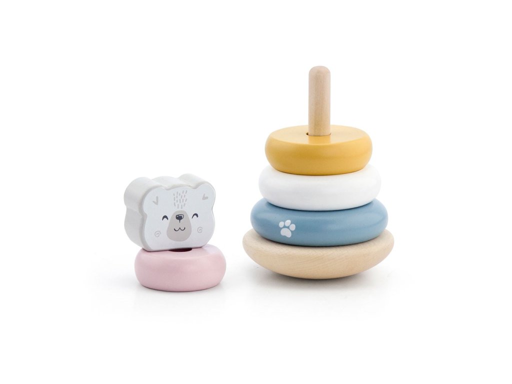 Vzdělávací pyramida od společnosti Viga je klasická hračka pro nejmenší, která vašemu dítěti poskytne zábavnou, zajímavou a kreativní hru. Sada v pastelových barvách obsahuje 6 diskových kostek různých velikostí, včetně jedné ve tvaru medvědí hlavy. V základně je kolík, na který se dílky nasazují. Tato hračka je ideální pro batolata, která začínají stavět věže z kostek. Pyramida podporuje rozvoj koordinace ruka-oko, logického myšlení a navíc podporuje učení rozpoznávání barev. Zde je třeba zdůraznit vzdělávací hodnotu pyramidy s medvědem.