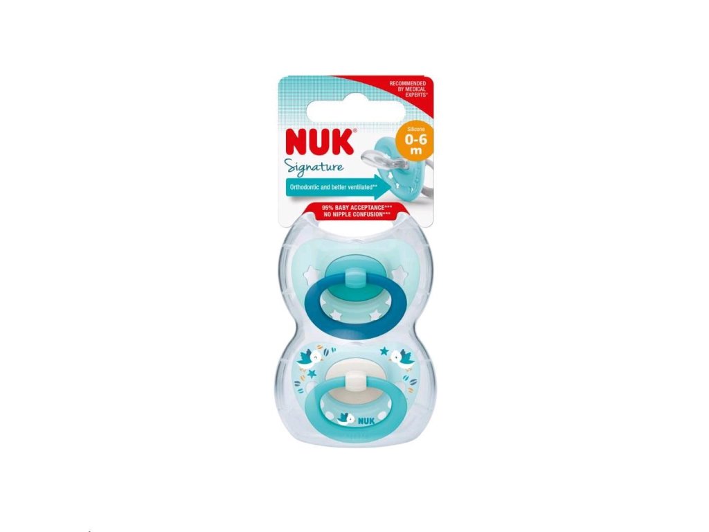 Kojenecký dudlík NUK Signature 0-6 měsíců. Dudlík má krásný barevný obrázek. Ortodontický tvar podporuje vývoj celé ústní dutiny dítěte. Dudlík je vylepšený a má ještě plošší tvar. Je vyroben z vysoce kvalitního plastu a silikonového dudlíku. Náustní kryt a kroužek jsou vyrobeny z polypropylenu a neobsahují BPA. Výhodou silikonu je to, že je bez zápachu a lehce se čistí. Neobsahuje BPA. Velikost 1 (0-6 měsíců). Všechny NUK dudlíky jsou pravidelně testovány a sledovány nezávislými instituty. V balení 2 kusy.