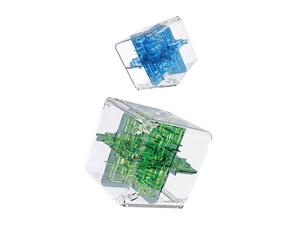 Bludiště 3D kostka. Velikost 9cm. Cílem je dostat kuličku do jamky. Lze postupovat podle číslic na jednotlivých stěnách.