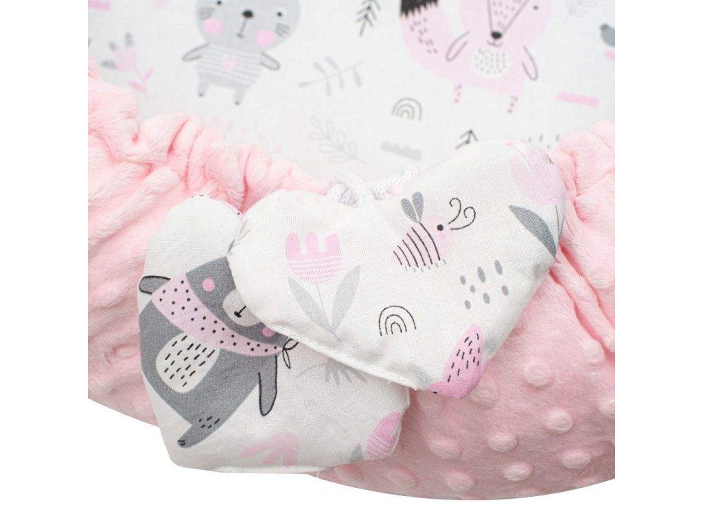 Hnízdečko má praktickou šňůrku, kterou lze upravovat velikost, může se více stáhnout anebo úplně uvolnit. Hnízdečko je vyrobené ze dvou typů tkanin, první je velmi měkká a na dotek příjemná, hebká Minky látka s výstupky pro stimulaci senzomotoriky a druhá je 100% bavlna. Součástí hnízdečka je polštářek ve tvaru srdce a peřinka zdobená srdíčkem. Hnízdečko má mnoho využití, lze používat v postýlce, v kočárku, na pohovce i na zemi.