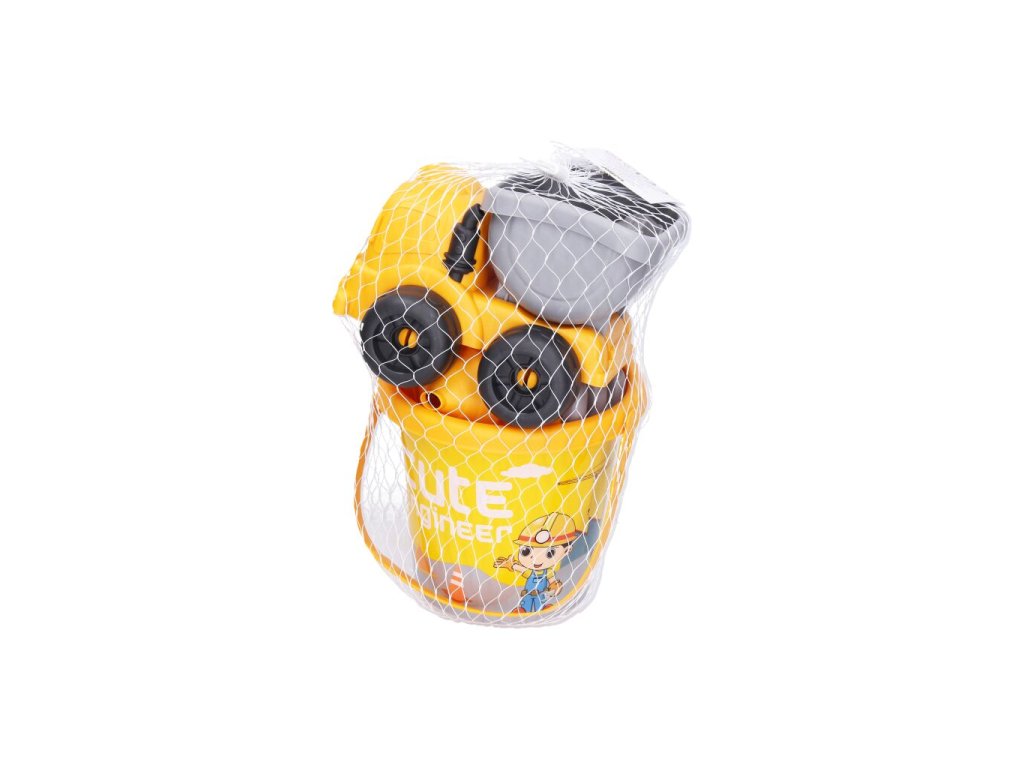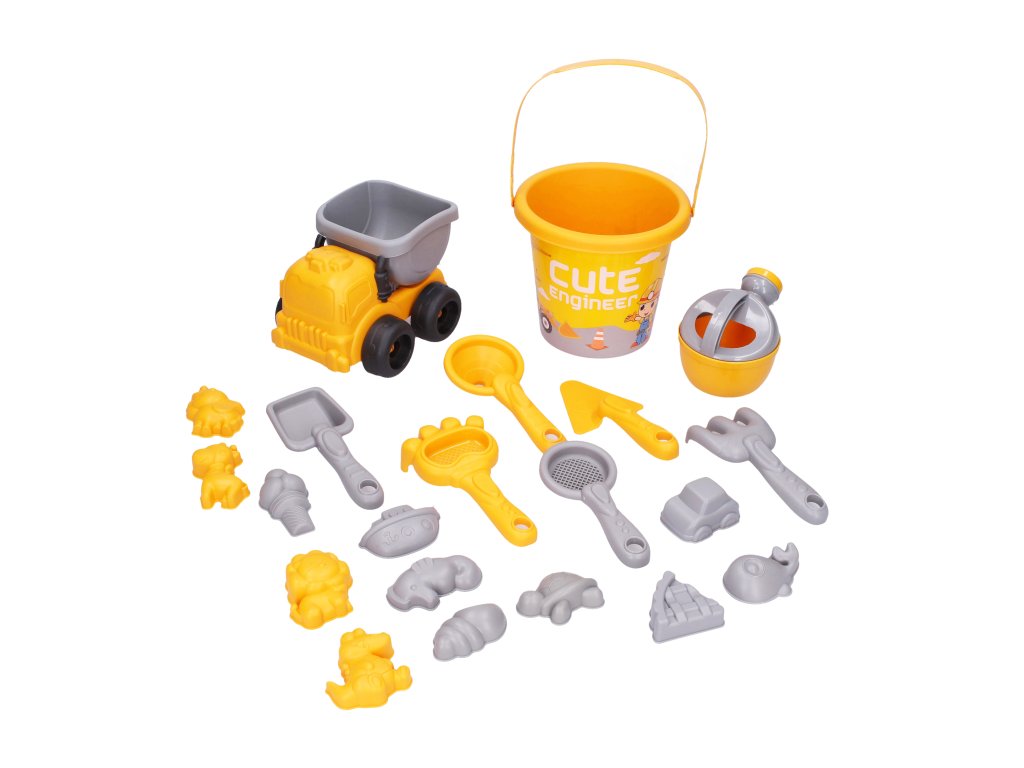 Součástí balení je nejen klasický kyblík a lopatky, ale také autíčko, které pomůže s převozem „stavebního materiálu“. Nechybí ani konvička, sítko a řada formiček různých tvarů – od zvířátek po dopravní prostředky. Barevné provedení v kombinaci žluté a šedé působí hravě a přehledně.