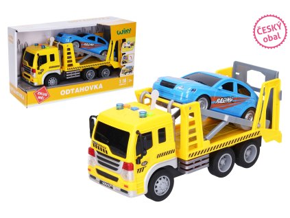 Tahač s autem. Rozměry tahače 26x10x14 cm. Na setrvačník. Světelné a zvukové efekty tlačítky na kabině tahače.