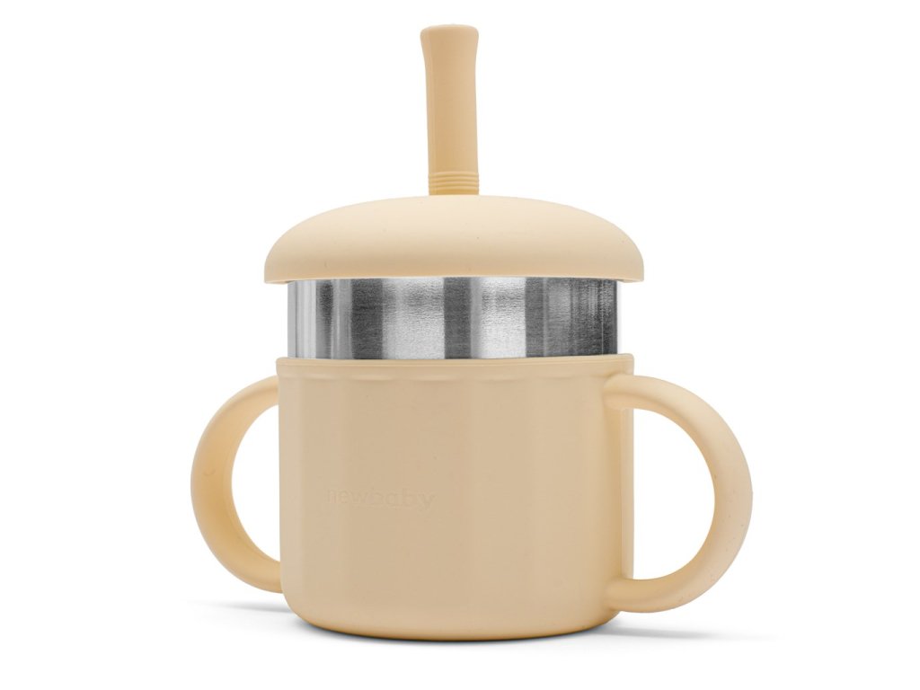 Silikonový hrneček 2 v 1 značky New Baby, který spojuje moderní design s funkčností, ideální pro děti již od prvních dnů života (0+).