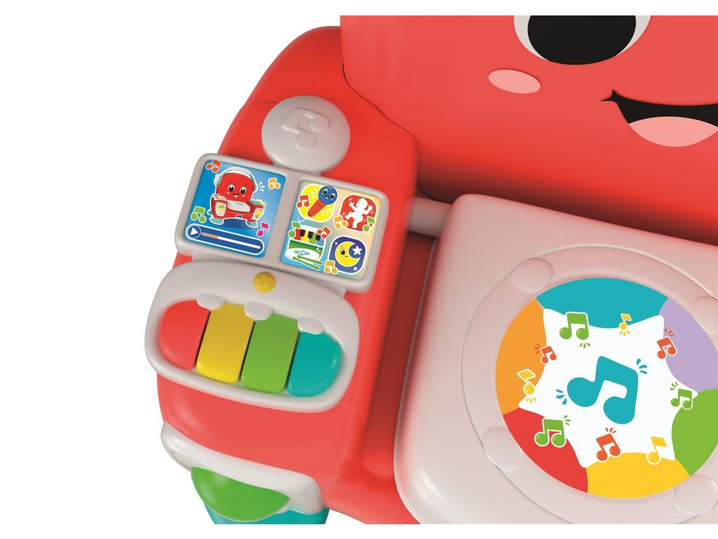 Na opěrce rukou jsou umístěna tlačítka pro přehrávání hudby a písniček. Ty děti povzbuzují ke zpívání, tanci a aktivní hře. Křesílko nabízí také uklidňující režim s jemnými melodiemi.