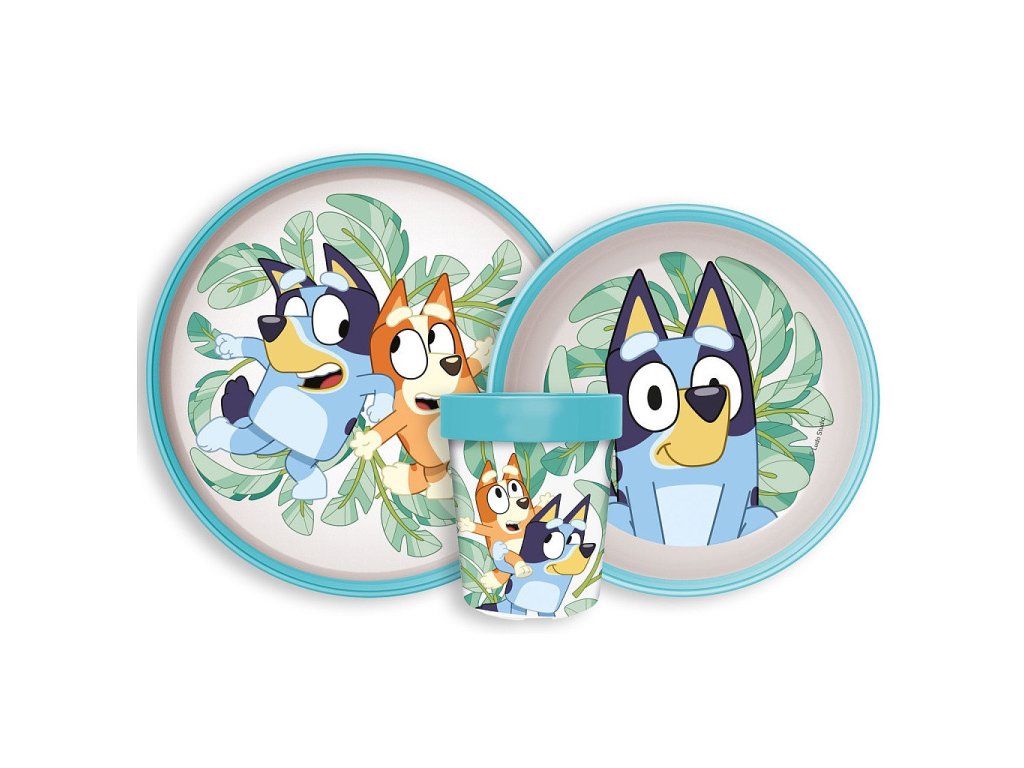 Dětský plastový jídelní set BLUEY s protiskluzem a kelímkem tyrkysová