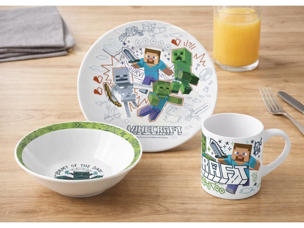 Potěšte malé fanoušky populární hry Minecraft stylovým keramickým jídelním setem pro děti, který promění každé jídlo v dobrodružství. Barevný design s oblíbenými Minecraft motivy zaujme na první pohled a podpoří děti v samostatném stolování.