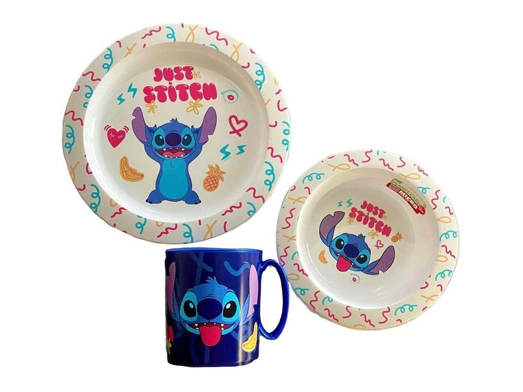 Veselé stolování se zubatým mimozemšťánkem Stitchem. Jídelní plastová sada s hrnečkem potěší všechny děti, kterým bude z těchto talířků jistě více chutnat. Sada je vyrobena z ekologického recyklovaného a zdravotně nezávadného materiálu bez obsahu BPA. Obsahuje mělký talířek 22 × 2 cm, hlubší misku 16 × 3,5 cm a hrnek 350 ml.