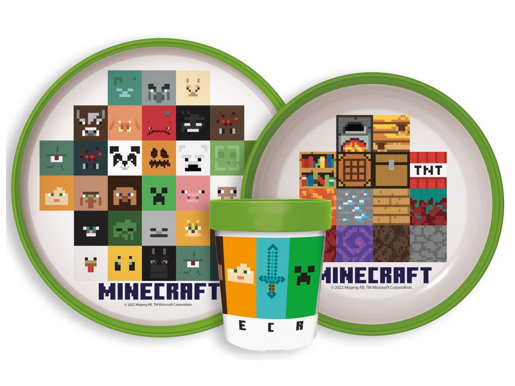 Dětský plastový jídelní set MINECRAFT s protiskluzem a kelímkem zelený