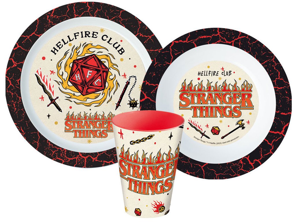 Stylová dětská jídelní sada inspirovaná kultovním seriálem Stranger Things potěší všechny malé i větší fanoušky tajemna a dobrodružství. Perfektní volba pro kluky i holky, kteří se nebojí vystoupit z normálu a chtějí mít originální nádobí.