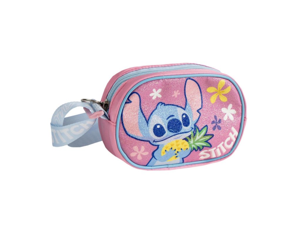 Krásná dívčí kabelka Disney Lilo & Stitch je ideálním doplňkem pro malé holčičky. Přední stranu zdobí veselý motiv mimozamšťánka Stitche držícího ananas na třpytivém růžovém podkladu s květinovými detaily, který kabelce dodává hravý a letní vzhled. Jemné pastelové barvy a glitter efekt zaujmou na první pohled.
