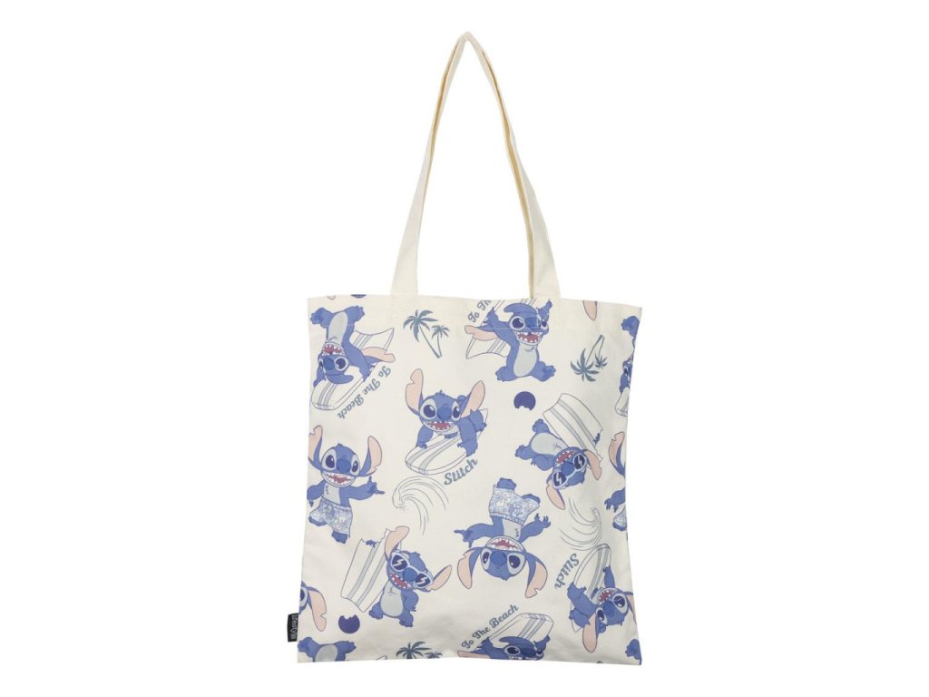 Taška je zdobená veselými motivy Stitch v různých pozicích, doplněnými letními prvky, jako jsou surfy a palmy. Světlé provedení a opakující se vzory působí hravě a zaujmou děti i dospělé fanoušky této ikonické postavy. Díky dlouhým uším se pohodlně nosí přes rameno a hodí se na nákupy, do školy, na pláž i volný čas.