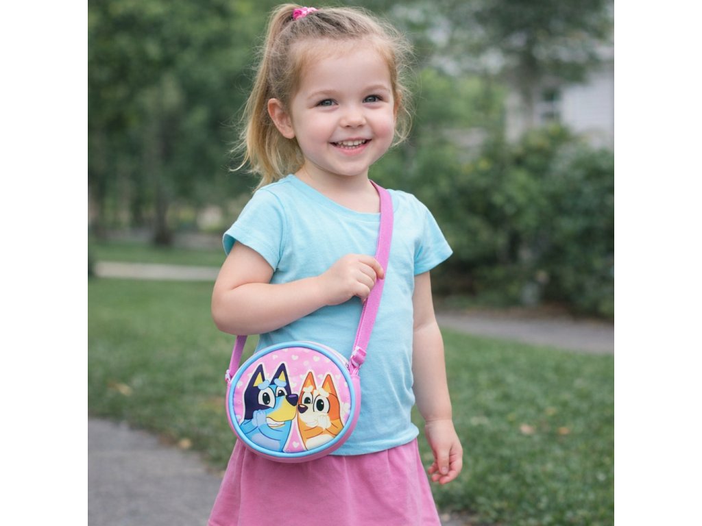 Kabelka pro holky, co fandí Bluey. Kulatá dívčí kabelka typu crossbody je opatřena přezkou, uvnitř polyester podšívkou a má zavírání na zip. Kabelka je v krásném růžovém provedení s potiskem srdíček a vyobrazením pohádkových kámošů.