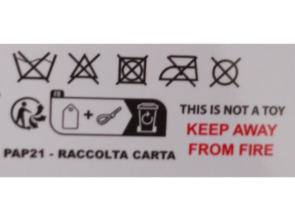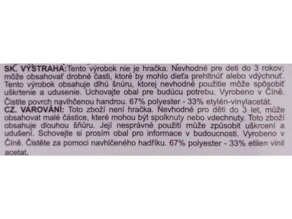 Bezpečnostní pokyny: toto zboží není hračka, nevhodné pro děti mladší 3 let. Obsahuje malé části, které mohou být spolknuty nebo vdechnuty. Toto zboží obsahuje i dlouhou šňůrku, jejíž nesprávné použití může způsobit udušení či uškrcení. Nepřibližujte k otevřenému ohni.