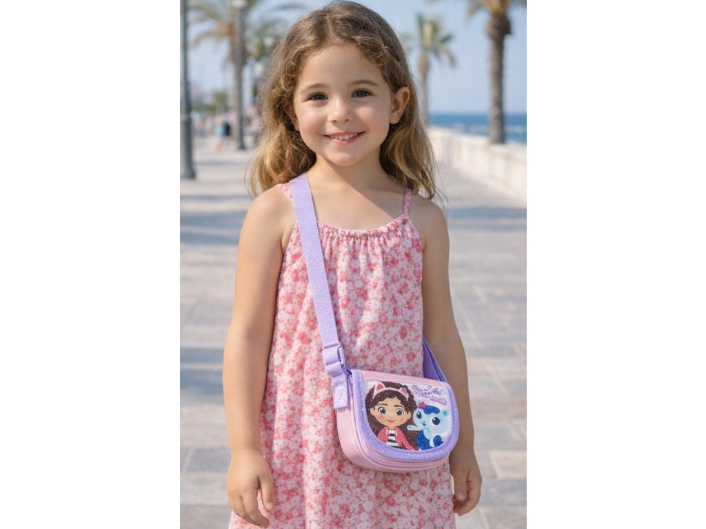 Dívčí kabelka s Gábinkou je nádherný módní doplněk pro naše malé holčičky. Kabelka má sympatické barvičky růžovou a fialovou a přední klopu nádherně třpytivou. Má přezku přes rameno s regulací délky, zapínání na suchý zip a uvnitř jednu velkou kapsu.