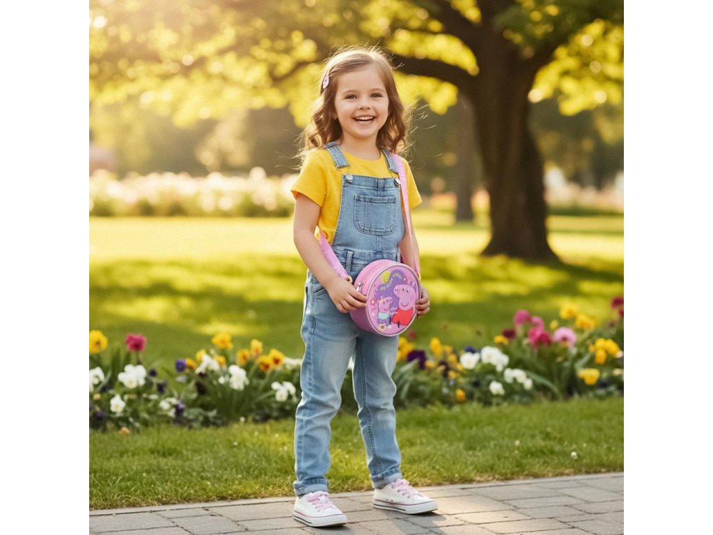 Roztomilá 3D kabelka Peppa Pig přes rameno je ideální doplněk pro malé parádnice 💗. Díky veselému motivu Peppy a její sestřičky si ji zamiluje každá holčička na první pohled 🐷✨. Kabelka má kulatý 3D design, který krásně vynikne a dodá dětskému outfitu hravý a stylový vzhled.