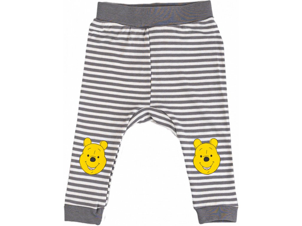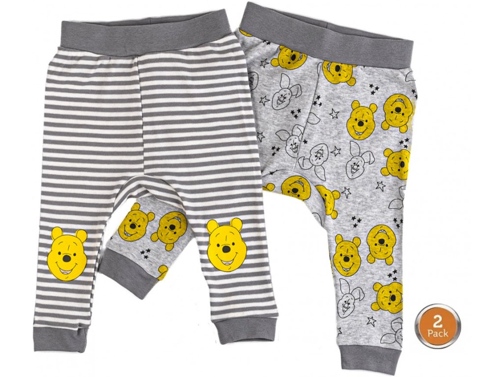 Praktické dětské tepláčky Disney Medvídek Pú v balení 2 kusů jsou ideální součástí výbavičky pro miminka. Set obsahuje jedny šedé tepláky s proužkovaným vzorem a obrázkem medvídka Pú a druhé šedé s celoplošným potiskem oblíbené postavičky. Veselý design v neutrálních barvách působí hravě a roztomile a snadno se kombinuje s dalším oblečením.