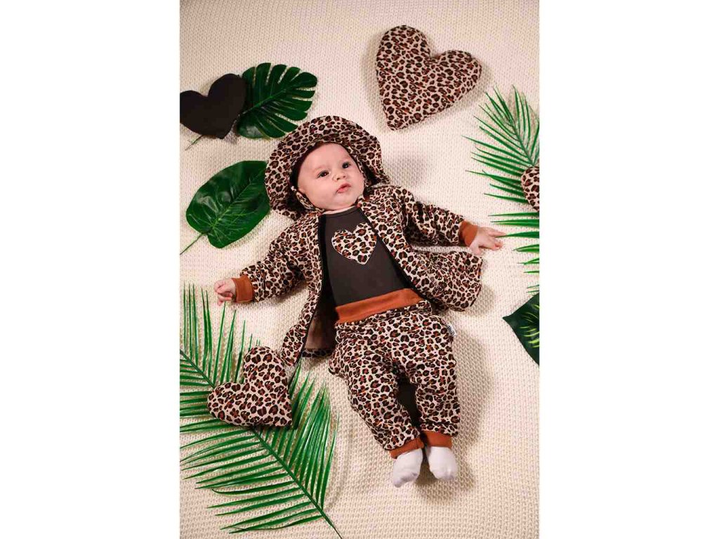 Klobouček zdobí vzor leopardí srsti a volánek. Zavazuje se na tkaničky. Miminko se v něm bude cítit velmi příjemně a útulně.
