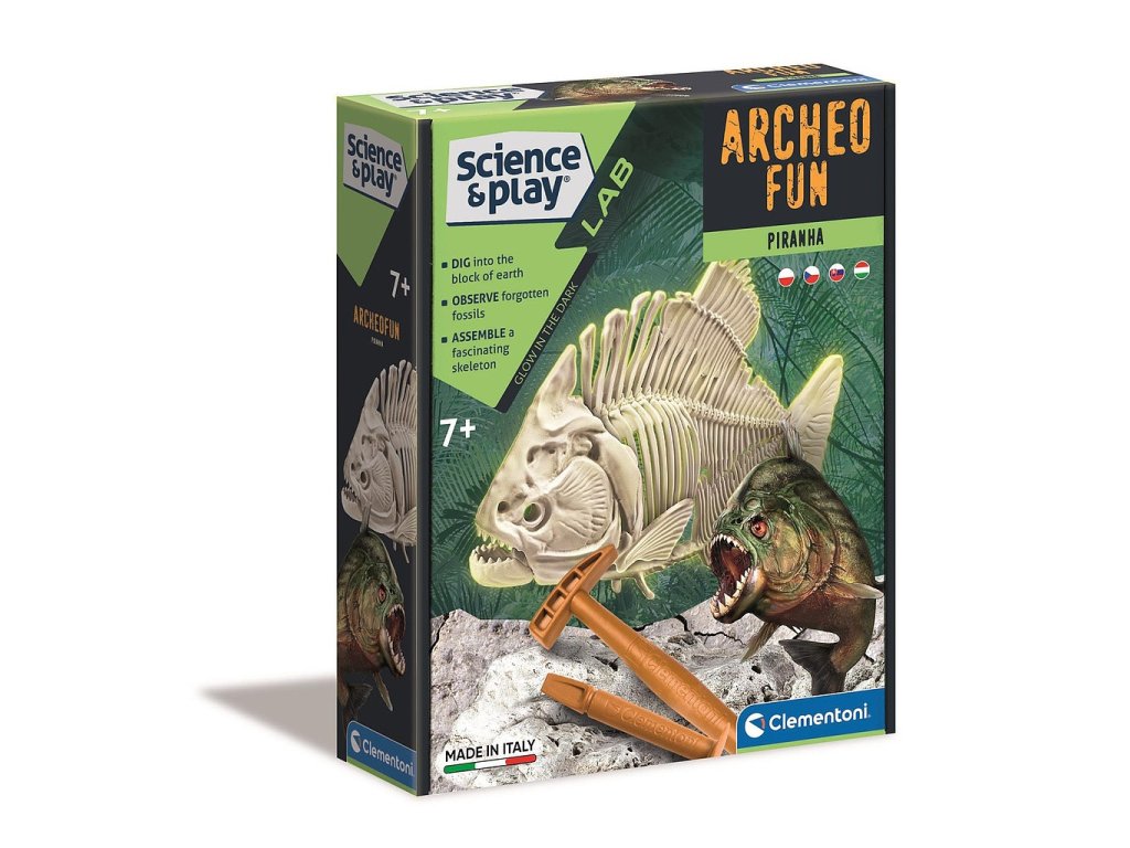 Objevování fosilií může začít. Archeologická sada Clementoni Archeo Fun Piranha přináší dětem možnost vyzkoušet si práci malého archeologa a odhalit kostru pirani ukrytou v bloku materiálu.