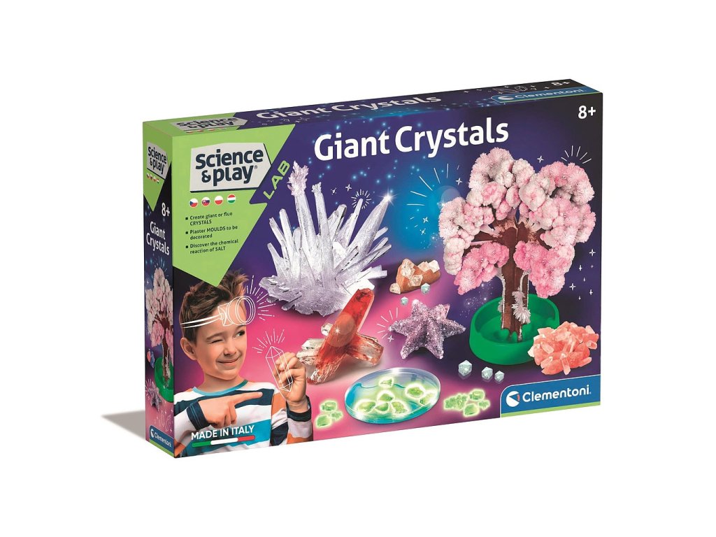 Experimentální sada Clementoni Giant Crystals umožňuje dětem objevovat fascinující svět chemie a krystalizace. Pomocí přiložených nástrojů a komponentů mohou vytvářet velké krystaly různých tvarů a barev a sledovat, jak postupně rostou.