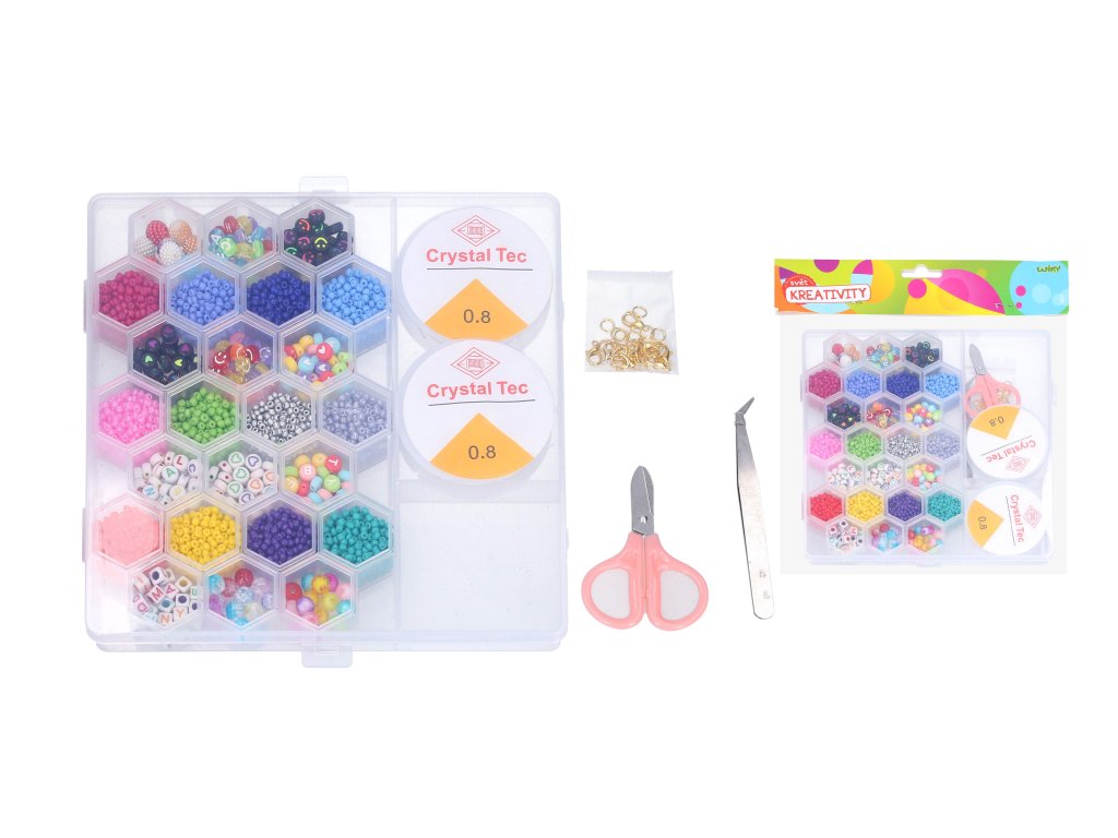 Korálky barevné set. Rozměry krabičky 19x14x3 cm.