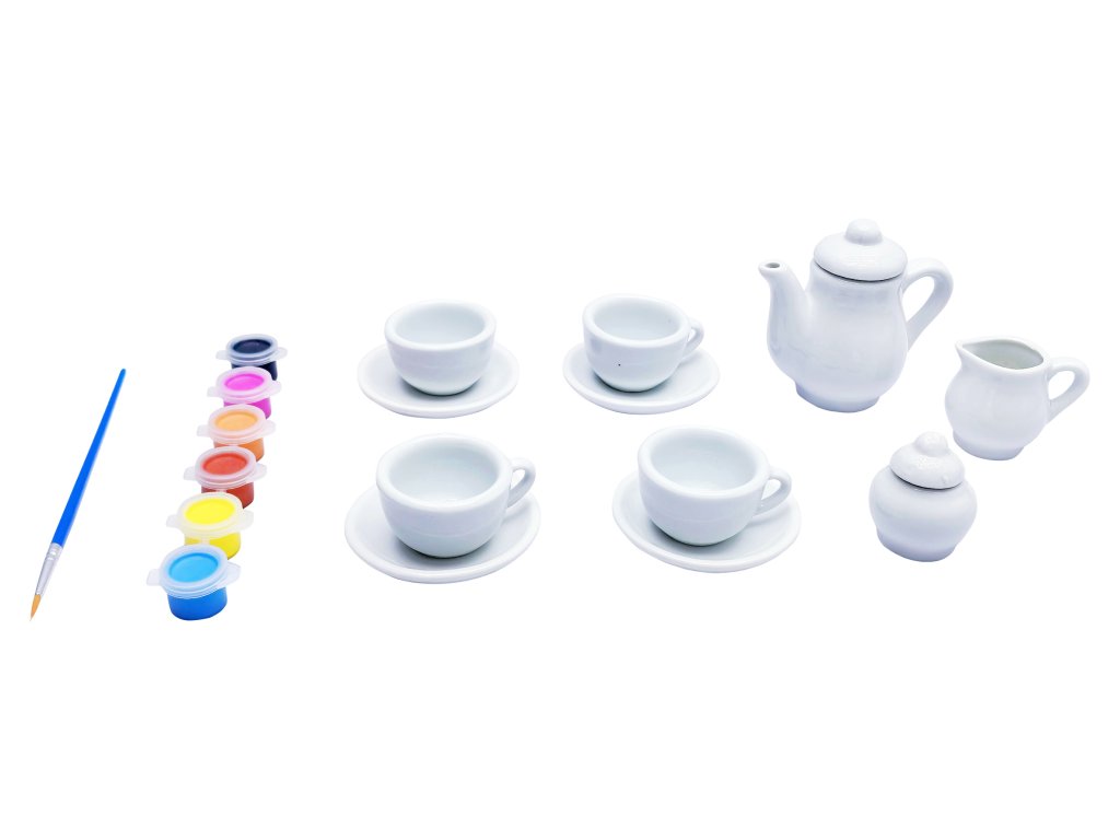 Obsahuje 6 barev, štětec, 4 hrnečky s podšálky, konvičku, cukřenku. Velikost konvičky 8x8x4cm.